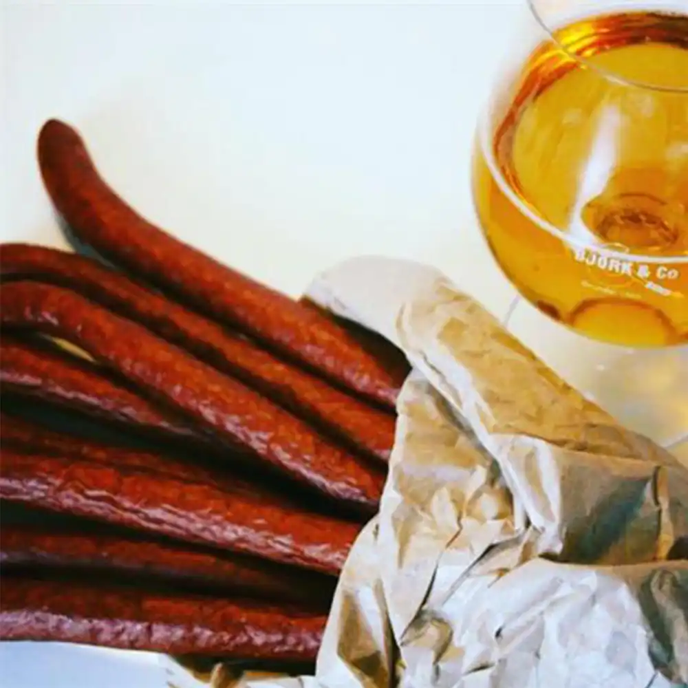 Smakrik korv med hög kötthalt. Röks lite lätt på en bädd av alspån, för att få den gyllenbruna färgen och den fylliga smaken.